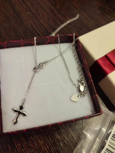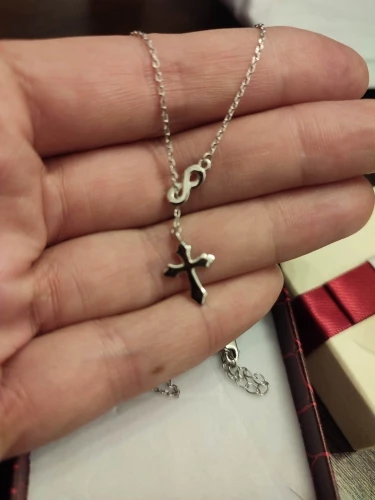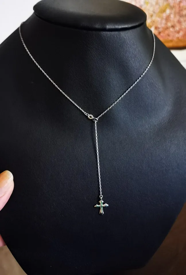 Crafted in S925 sterling silver with an elongated chain and a suspended cross at its end.